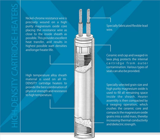 HIGH-DENSITY cartridge heaters are among the most versatile and widely used cartridge heaters throughout the industry. They are valuable for alleviating problems created by high watt densities, high wattage, excessive vibration, poor fit, or where short heater life is a constant problem.